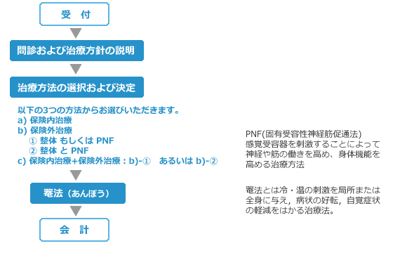 | ⅴ) | 罨法:5分間ほど 手技やクリームや湿布などを施し患部の好転を図ります。 |